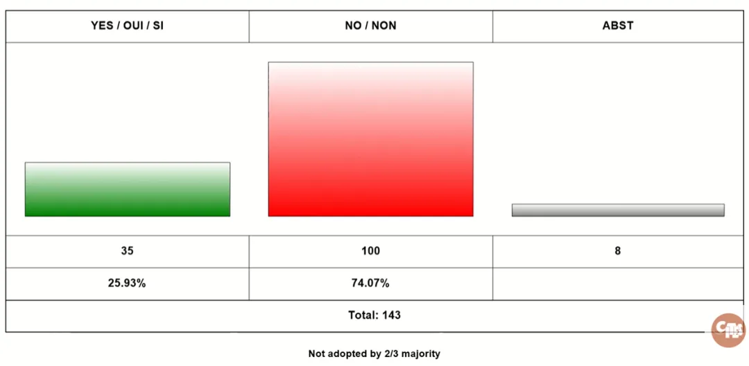 これらの努力は肯定的な反応を得ました。現地時間の11月27日正午、委員会の会議での採決は、反対100票、賛成35票、棄権8票という圧倒的な多数でこの提案を否決し、最終的に12月4日の全体会議で正式に可決されました。