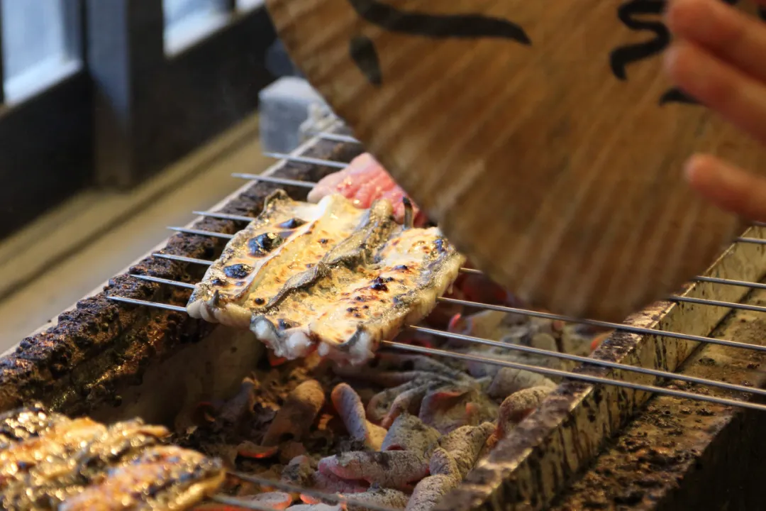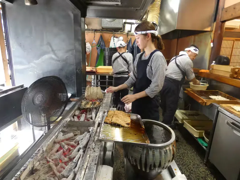 朝の表参道、老舗の「駿河屋」はすでに忙しく動き始めていた。江戸時代に始まったこの店は独自の営業スタイルを維持しており、ウナギの処理から備長炭で焼き上げるまでの全工程が参道からはっきりと見える。焼く際に漂う濃厚な香りは、通りかかる観光客の食欲を絶えず刺激している。
